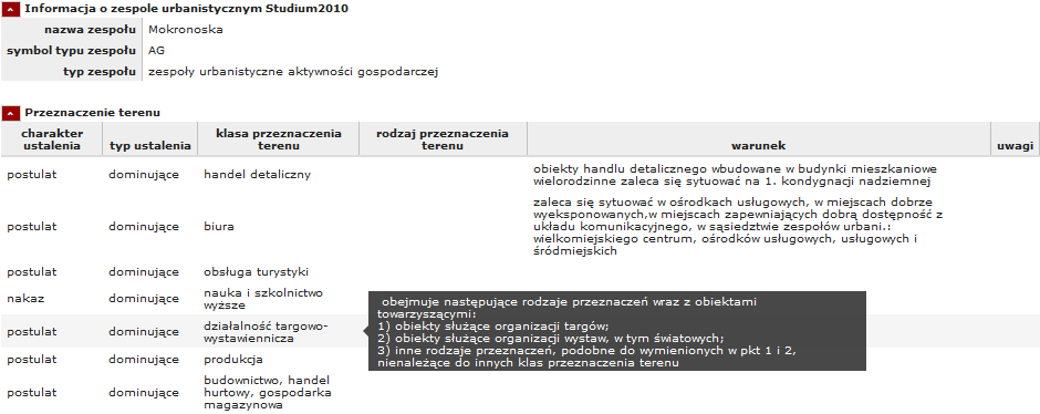 Szczegółowe informacje o przeznaczeniu terenu w wybranym zespole urbanistycznym.